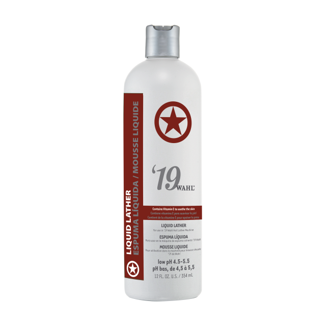 From Wahl Professional’s line of products, the ’19 Premixed Liquid Lather is intended for professional use only with the Wahl ’19 Liquid Lather Machine. Wahl’s ’19 Premixed Liquid Lather solution is ready-to-go right out of the bottle, simply our in, heat up, and you are ready to go! Available in two sizes, our lather contains vitamin E to soothe the skin, making it suitable and beneficial for sensitive skin types. To use Wahl Professional ’19 Premixed Liquid Lather, remove the lid of your Wahl ’19 Liquid Lather Machine, take out the retaining bottle, and unscrew the pump. Fill bottle up to (but not past) the fill line with liquid lather. Allow to heat for 50 minutes for optimal use. Wahl ’19 Premixed Liquid Lather (#68907-100) comes in a re-sealable 64 ounce bottle and a 12 ounce bottle (#68907). Designed for use with the Wahl Professional ’19 Liquid Lather Machine.